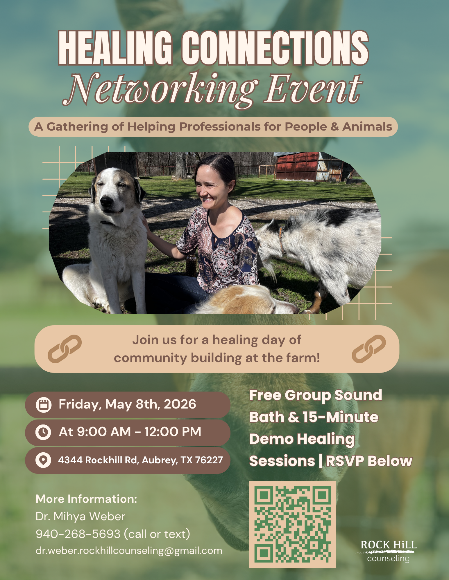 MWC’s Abby and Tabitha will be teaming up with Dr. Mihya Weber and Cathy Champ out at Rockhill Counseling to bring a morning of healing connection to helpers and healers in Aubrey, TX on the most peaceful, lovely, wonderful 11-acre animal-assisted therapy farm. Abby, Tabitha, and Mihya will be offering demo sound and energy healing sessions after a group sound bath, and there will be plenty of opportunities to connect and plan how you can collaborate with your neighbors and colleagues to bring more wholeness and health to our area. Demo session slots are limited, and going quick, so please be selfish! We hope to see you there.