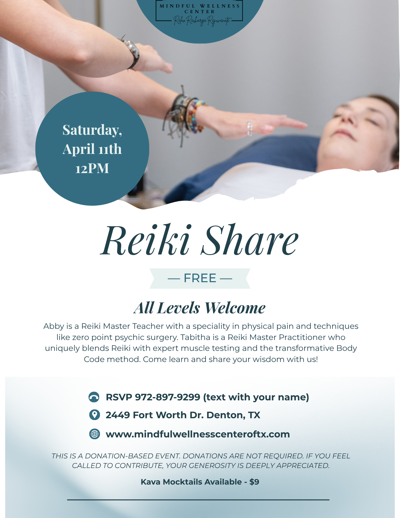Reiki Share Saturday, April 11, 2026 12:00 PM 1:30 PM Mindful Wellness Center of Texas 2449 Fort Worth Drive Denton, TX, 76205 United States (map) Google Calendar ICS
